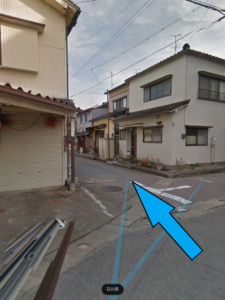 水色のアパートと奥の3階建ビルの駐車場の間の道を左折です。