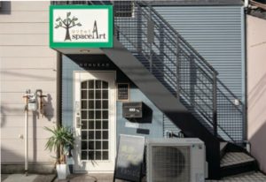 階段下の白いドアからお入りください。
